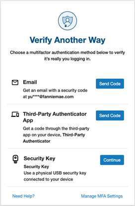 Multifactor Authentication (MFA) requires users to log in with the correct User ID, password, and another form of authentication, such as identity confirmation through an authentication app or an email address. Access to Fannie Mae browser-based applications requires the use of MFA.
