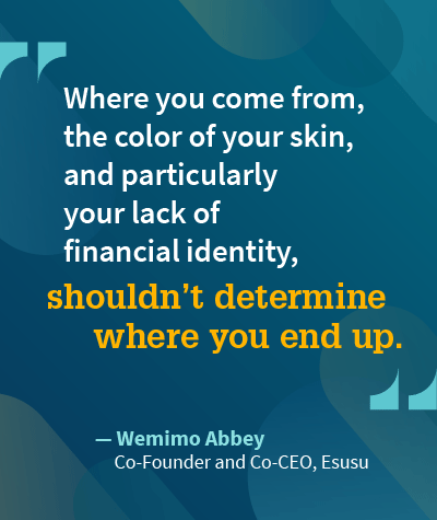 "Where you come from, the color of your skin, and particularly your lack of financial identity, shouldn't determine where you end up," says co-founder and co-CEO Wemimo Abbey. "That's what really gave us the inspiration to start Esusu."