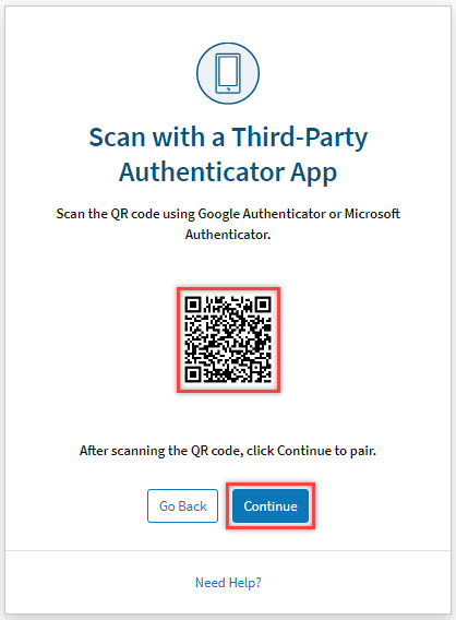 - Scan the QR code using the third-party authenticator app, then select Continue.