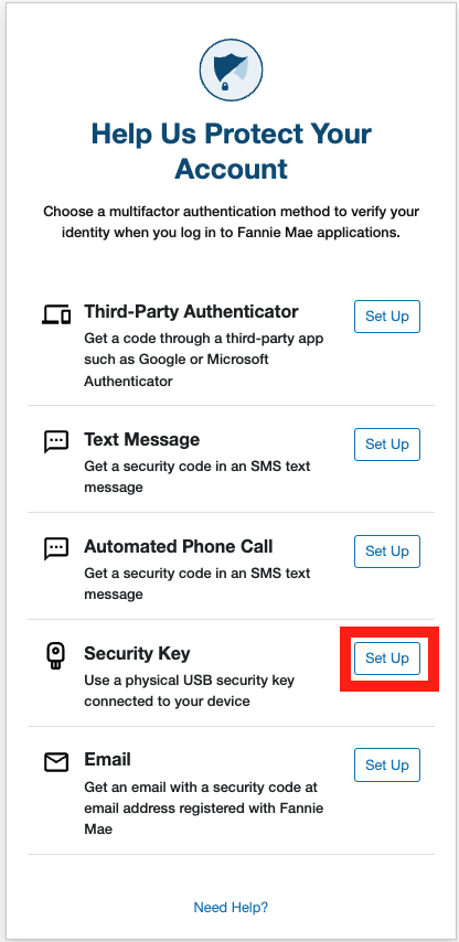 This section explains how to set up the Security Key authentication method for Fannie Mae multifactor authentication. The User can verify their identity by simply plugging a security key into the computer’s USB port. Different types of security keys are available for purchase from your preferred retailer.