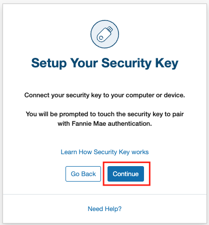 Once you pair your security key with Fannie Mae multifactor authentication, your next log in will prompt you to touch the security key to verify your identity.