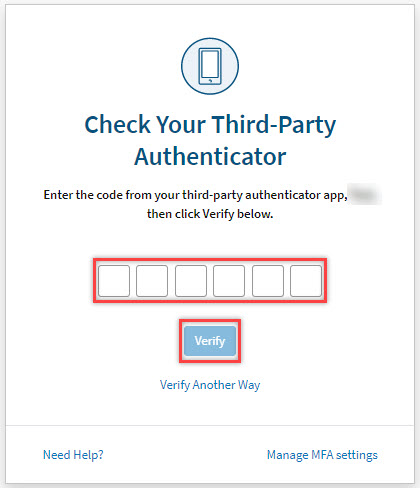 - Enter the 6-digit code from the registered third-party authenticator app in the boxes, then select Verify.