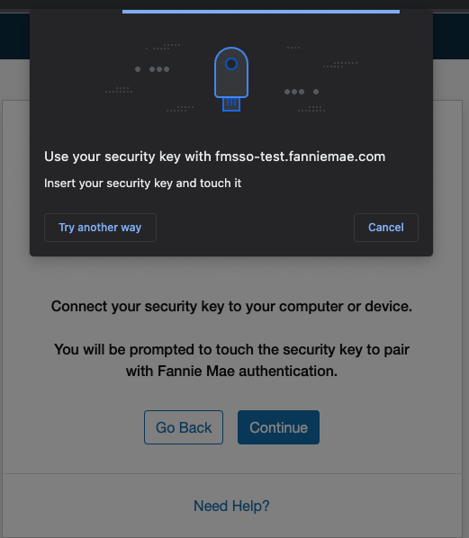 This section explains how a user verifies their identity using the security key method to manage their Multifactor Authentication. The user will be prompted to touch their security key, enter a pin or both, depending on the brand of security key to verify the user's identity.