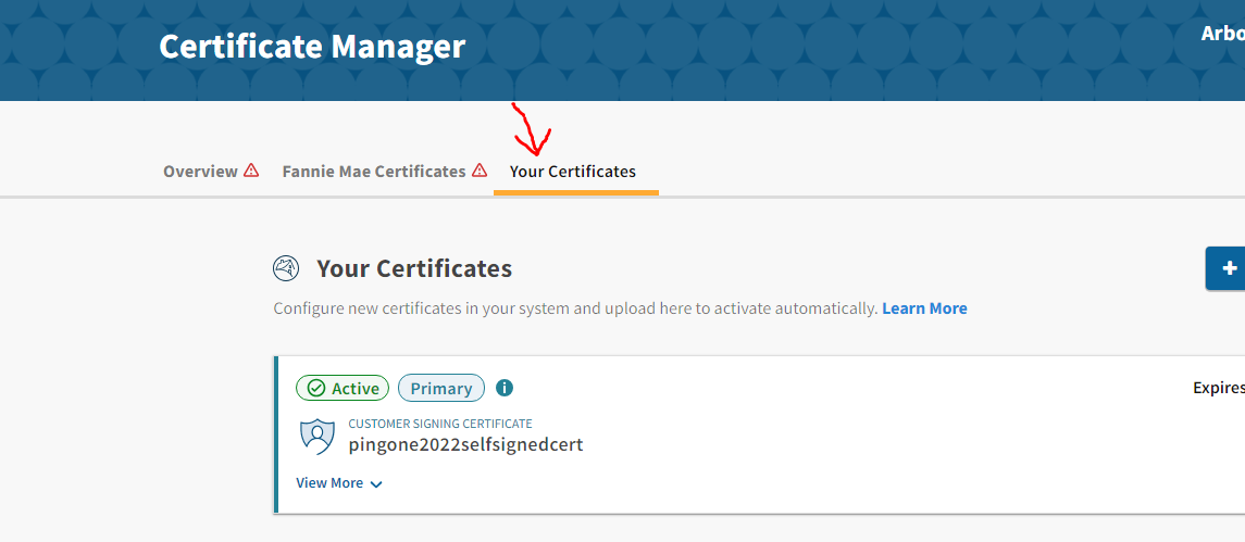 - After the new certificate is activated, your certificate status will show as Active and Primary on the page. Click the View More link to learn more about the certificate.