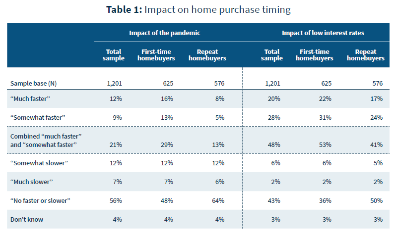 As shown in Table 1 below, 56% of respondents said the pandemic itself neither accelerated nor slowed their home purchase timeline. Among first-time homebuyers, 29% said it accelerated their home purchase decision, compared to only 13% of repeat homebuyers (often described as move-up buyers).