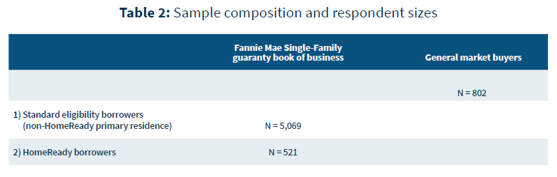 For this sample, two different subsamples were pulled: (1) standard eligibility, non-HomeReady® borrowers; and (2) HomeReady borrowers (HomeReady is Fannie Mae's 3% down payment mortgage product designed to help lower-income families gain access to mortgage credit).6