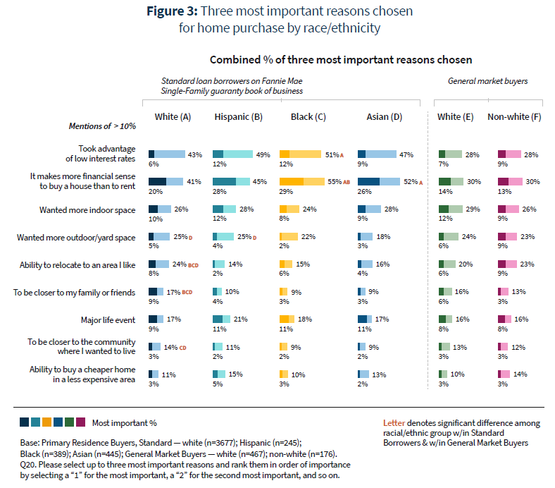 Figure 3 presents the results comparing race/ethnicity groups. Financial benefits again were the primary motivation for home-purchase motivations across race/ethnicity groups. Black and Asian homebuyers in Fannie Mae's guarantee book of business exhibited a stronger belief that owning makes more financial sense than renting, which was also cited most frequently as the most important homebuying reason across race/ethnicity groups.