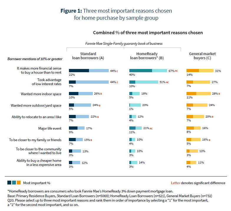 - Consumers from a large third-party panel who self-reported purchasing a primary residence using a mortgage from July 2020 to September 2021. This group is referred to below as "General Market Buyers." This sample includes homebuyers who could have any type of mortgage loan, including a government loan7, unlike the first sample whose loans were originated to Fannie Mae's eligibility standards.