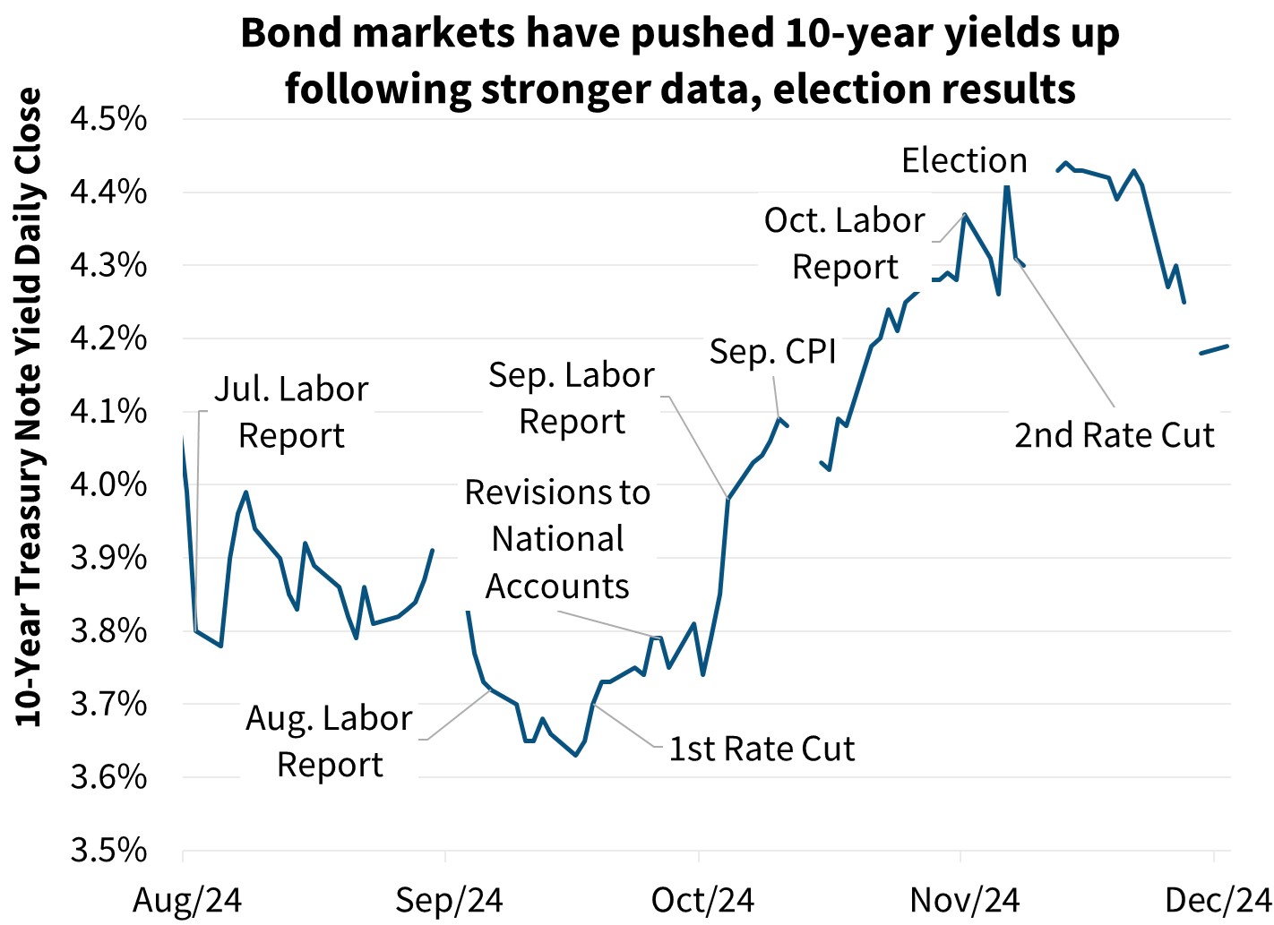 Our baseline expectation is for economic growth and employment gains to slow modestly next year and for core inflation to continue to ease — but not to reach the Fed’s target until 2026. Still, there is considerable upside risk to our economic forecast stemming from the potential for continued resilience in consumer spending and stronger-than-anticipated productivity growth. However, a meaningful slowdown in immigration flows or significant tariffs point to downside risk to economic growth and upside risk to inflation measures. Potential tax and regulatory policy changes present both upside and downside risks that may also impact interest rates.