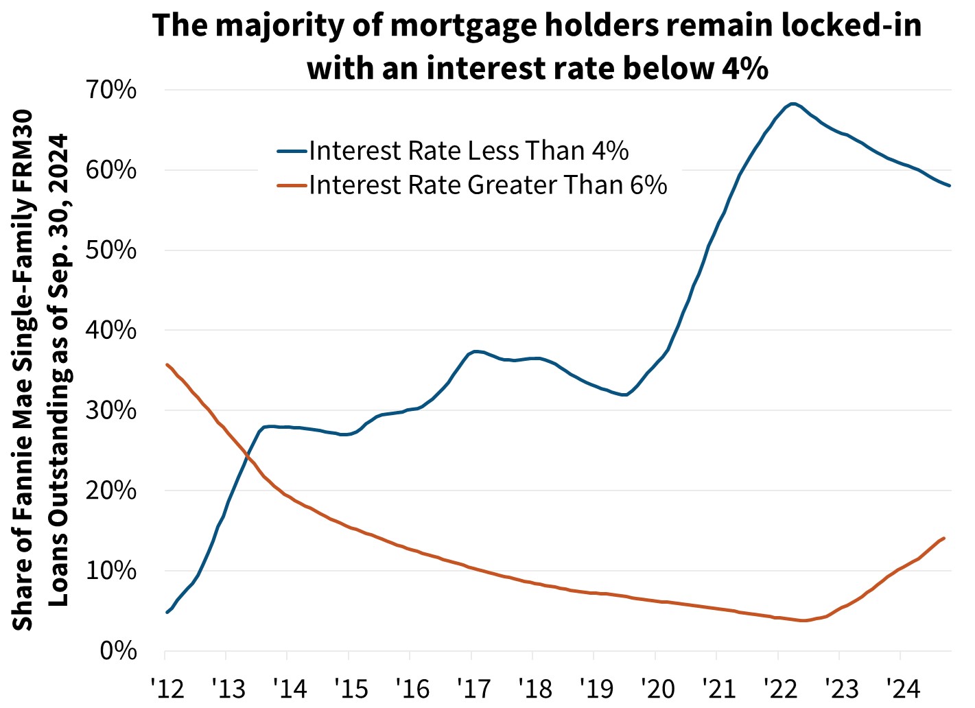 Affordability conditions remain at the most constrained levels since the mid-1980s. Additionally, we expect the lock-in effect to remain prominent, even if mortgage rates move closer to 6 percent. At the end of September, 58 percent of Fannie Mae single-family loans with a 30-year fixed rate mortgage had a rate under 4 percent, compared to 14 percent with a rate greater than 6 percent. The downward slope in the share of single-family loans with a rate below 4 percent and the upward slope in the share with a rate greater than 6 percent shows that, as expected, the lock-in effect will fade over time, but we believe the process is likely to be a slow one.