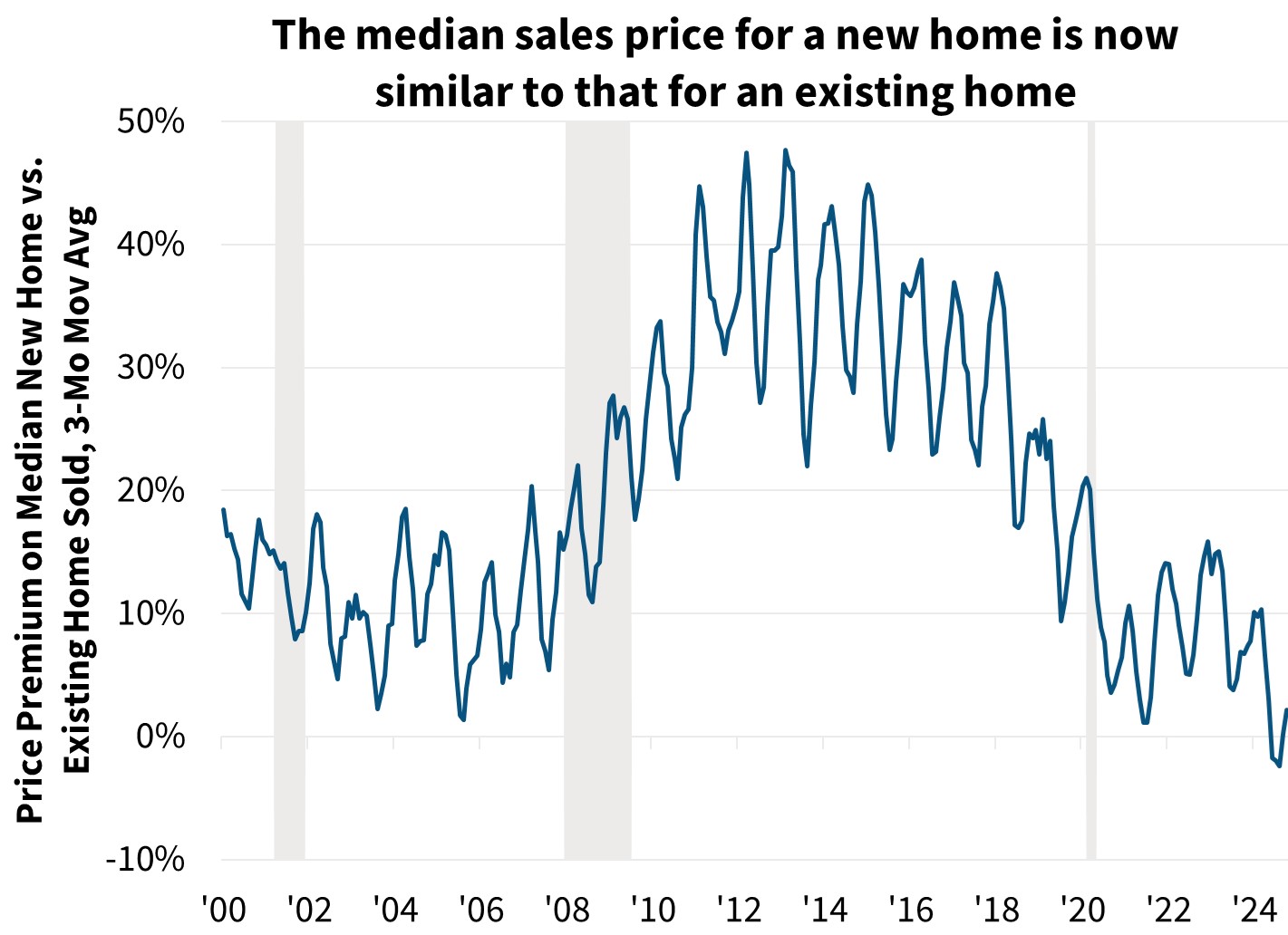Whereas historically the median sales price on new homes has far exceeded the median sales price on existing homes, that gap has narrowed in recent years. The price premium between the median price on a new vs. existing home sold has averaged about 4 percent in 2024, compared to an average of 28 percent between 2015 and 2019. Admittedly, this measure does not consider the difference in the geographic distribution of new homes sold, but part of the lower price premium is due to a decline in the median square footage of new homes from a peak of 2,519 square feet in the first quarter of 2015 to 2,158 square feet as of the third quarter of 2024.