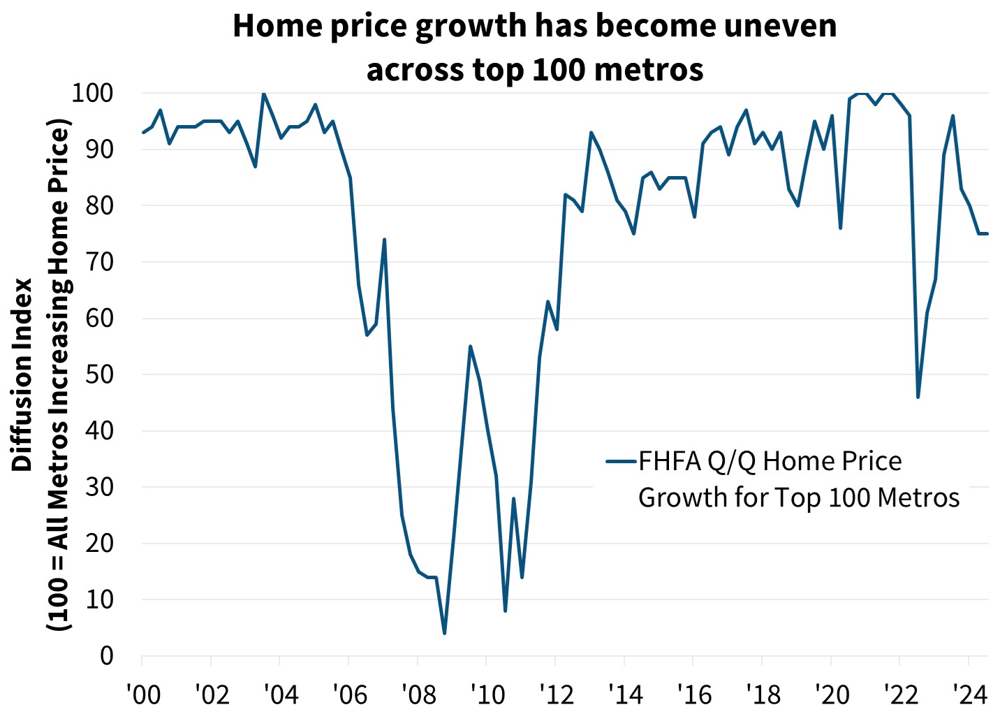 That said, there will likely be considerable regional differences. Regional variation in for-sale inventories is currently driving a diverging home price story. Of the FHFA top 100 metros, 75 experienced positive seasonally adjusted quarter-over-quarter home price growth in both the second and third quarters of 2024, a relatively small share historically outside of the Great Financial Crisis and the third quarter of 2022 when home prices declined nationally. We believe it is likely that regions with a greater inventory of homes available for sale will continue to experience weaker home price dynamics relative to the national average in 2025.