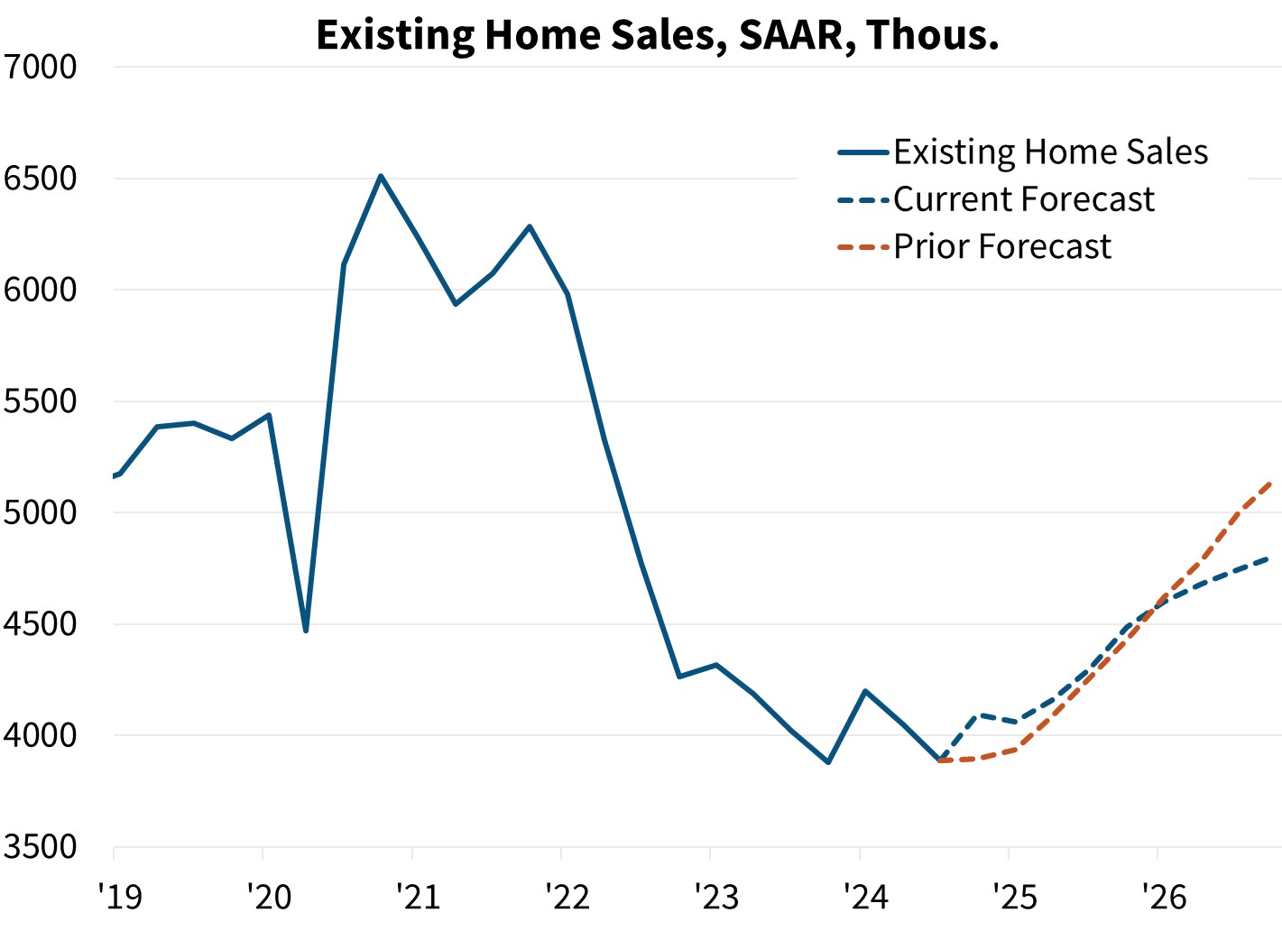 We forecast existing home sales to total 4.25 million in 2025, an improvement of 4.8 percent compared to our expected 2024 sales pace of 4.06 million, but still down 20.3 percent compared to 2019. We expect the increased inventory of homes available for sale will drive a modest improvement in existing home sales next year. According to the National Association of Realtors, the total number of homes available for sale at the end of November was 1.37 million units, up 19.1 percent from a year prior. However, given our mortgage rate outlook for rates to stay above 6 percent in 2025, we expect both constrained affordability conditions and the lock-in effect will continue to be the dominant themes limiting the recovery of existing home sales in 2025.