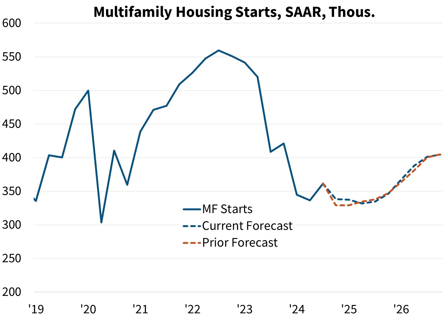 Our multifamily housing starts forecast was revised higher in the near term based on incoming data, though the rest of the path was essentially unchanged. While the multifamily starts series is notoriously volatile, we continue to believe demographic trends will be supportive of multifamily construction in the longer term once the current high levels of units in the construction pipeline are completed.