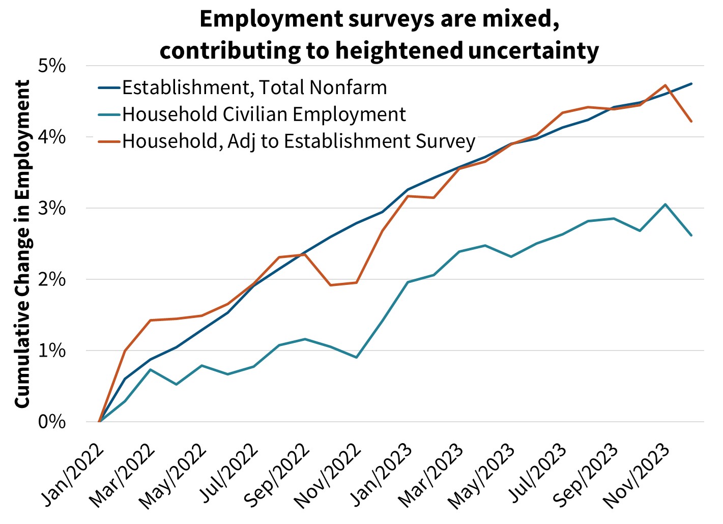 Still, we believe the economy remains at a higher-than-normal risk for a recession in 2024. Monetary policy works with long lags, so the higher rates over the past year are still likely to weigh on business and consumer activity into 2024. Furthermore, with an expectation of slow economic growth, there will be little momentum in the economy to absorb any unforeseen economic shocks that could emerge. It should be noted that there are mixed labor market signals currently in the data. The headline payrolls number showed a solid 216,000 jobs added to the economy in December, but the corresponding household employment survey showed a decline of 683,000 jobs. While some of this spread is due to definitional differences, controlling for this still illustrates a divergence. Also of note is the ISM Services Index showing a large decline in its employment measure over the month.