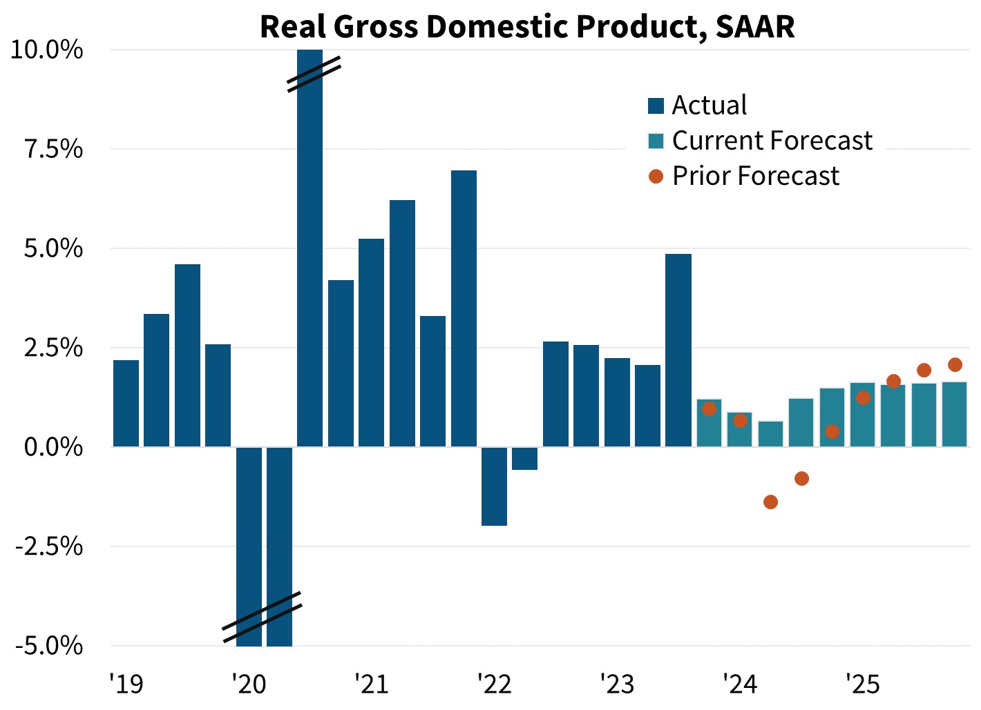 Primarily due to easing financial conditions and incoming real income data, we have changed our 2024 recession call to a forecast for a period of sub-potential growth rather than an outright contraction. The factors that we expected would drag the economy into a recession remain; thus, we still expect a slow rate of expansion, and recession risk remains elevated. Our 2024 GDP outlook increased from a 0.3 percent Q4/Q4 contraction to a 1.1 percent Q4/Q4 increase.