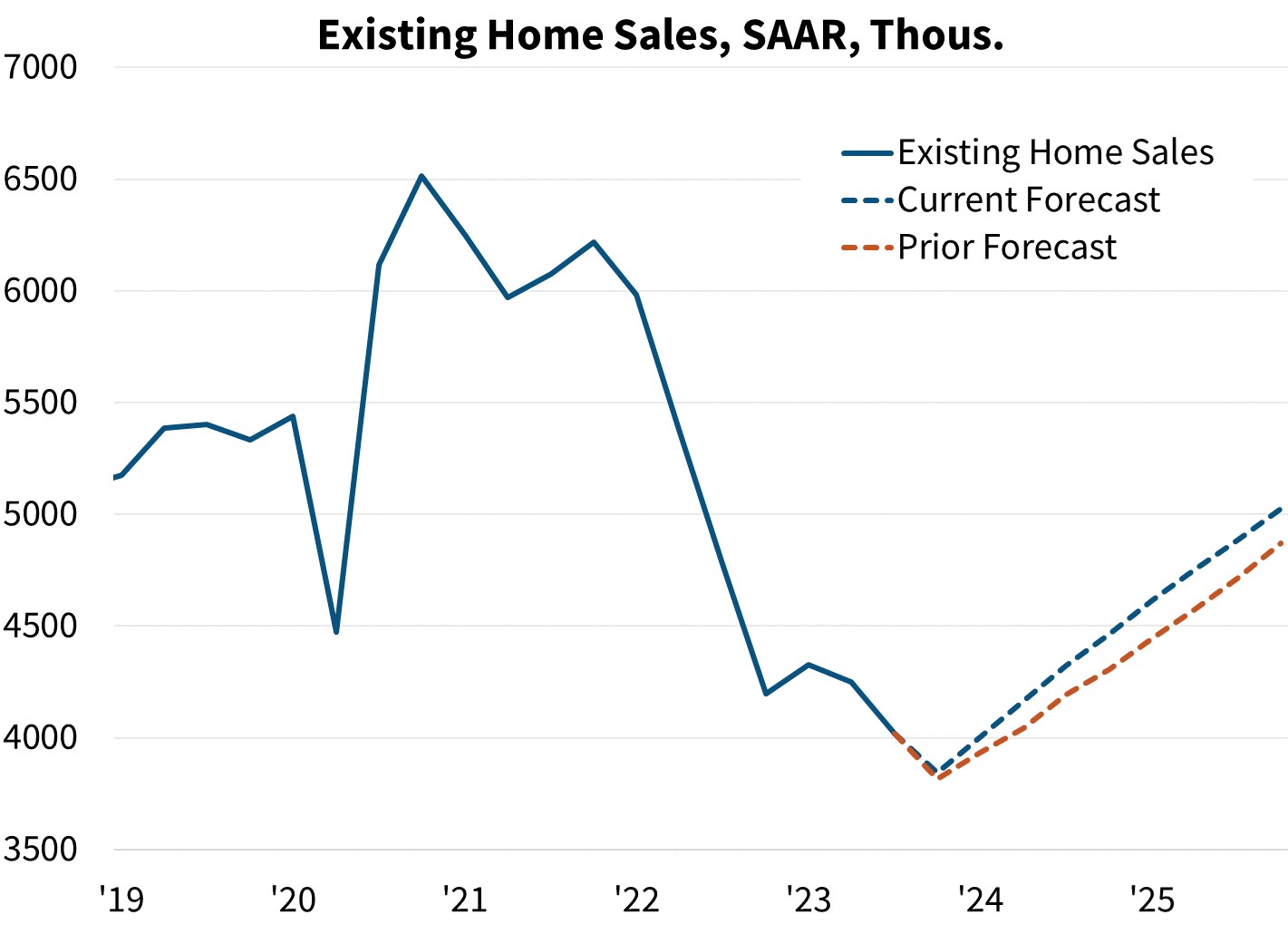 While we expect affordability will remain stretched and the supply of homes for sale tight, an easing in mortgage rates is expected to begin thawing the existing home sales market, which was held back in 2023 by strong lock-in effects. Furthermore, many homebuyers and sellers in 2020 and 2021 likely pulled forward their moving intentions to take advantage of low mortgage rates and remote working options following the COVID-19 pandemic, reducing the pool of homeowners wishing to move soon thereafter. As time progresses, however, we believe this effect will wane, and when combined with existing homeowners who delayed their moves in 2023 due to high mortgage rates, we expect that a growing number of home sales will occur. While we are still anticipating a comparatively sluggish pace of existing home sales, as affordability and a lack of supply remain challenges to the market, we are forecasting successive quarterly sales increases in 2024 with sales ending the year around 4.5 million annualized units in Q4 compared to the year low of around 3.8 million annualized units in Q4 2023. For the year, we forecast existing sales to rise 3.1 percent in 2024.