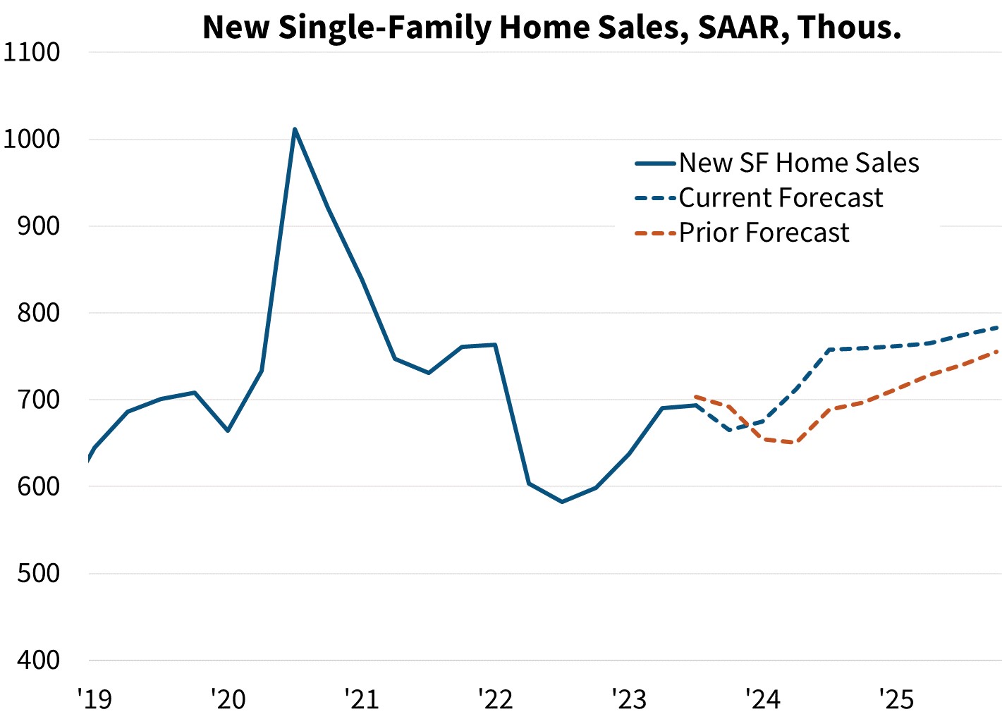 New single-family home sales declined 12.2 percent to a seasonally adjusted annualized rate (SAAR) of 599,000 in November; however, this series is volatile. The lower projected interest rate path and the removal of our recession call led us to upgrade the forecast for new home sales for most of our forecast horizon, as was done with existing home sales. New home sales are historically more sensitive to economic downturns, so in changing our economic outlook, the forecast revision is proportionally large relative to the change in our existing home sales forecast.