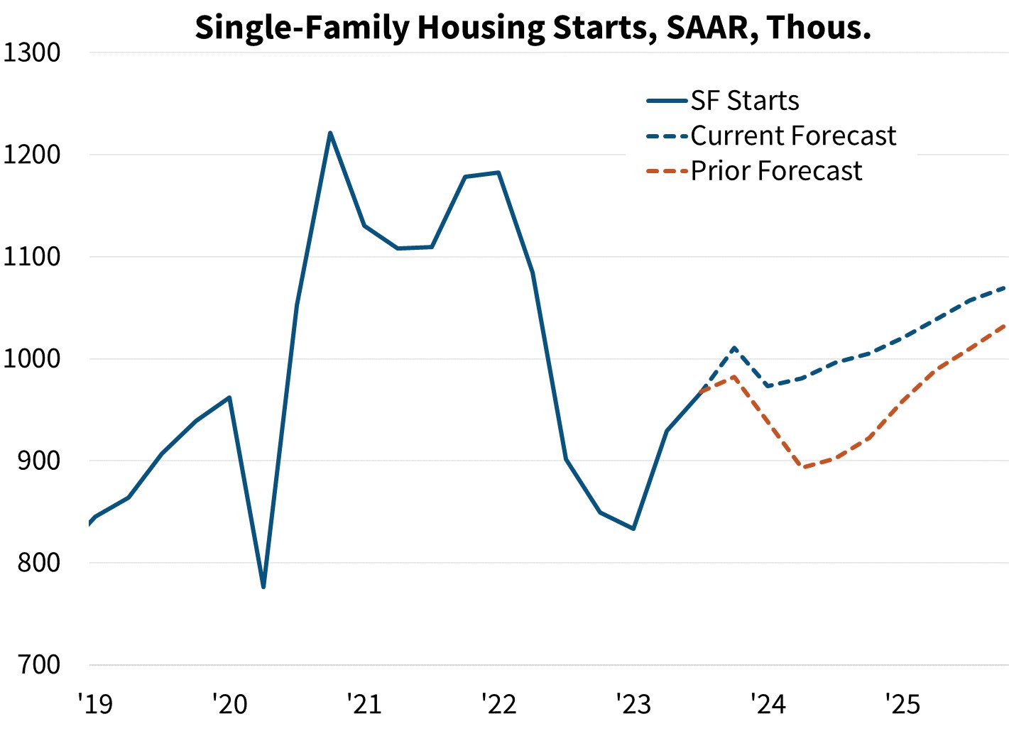 Single-family housing starts jumped to a SAAR of 1.14 million, which we expect is not sustainable given incoming permits data, which tends to be a less volatile series, coming in at a lower pace of 977,000. While we expect a near-term pullback in the starts number, we have revised our forecast upward reflecting the lower projected interest rate path and the removal of our recession call. We continue to expect that the lack of existing homes available for sale will contribute to ongoing growth in new home construction.