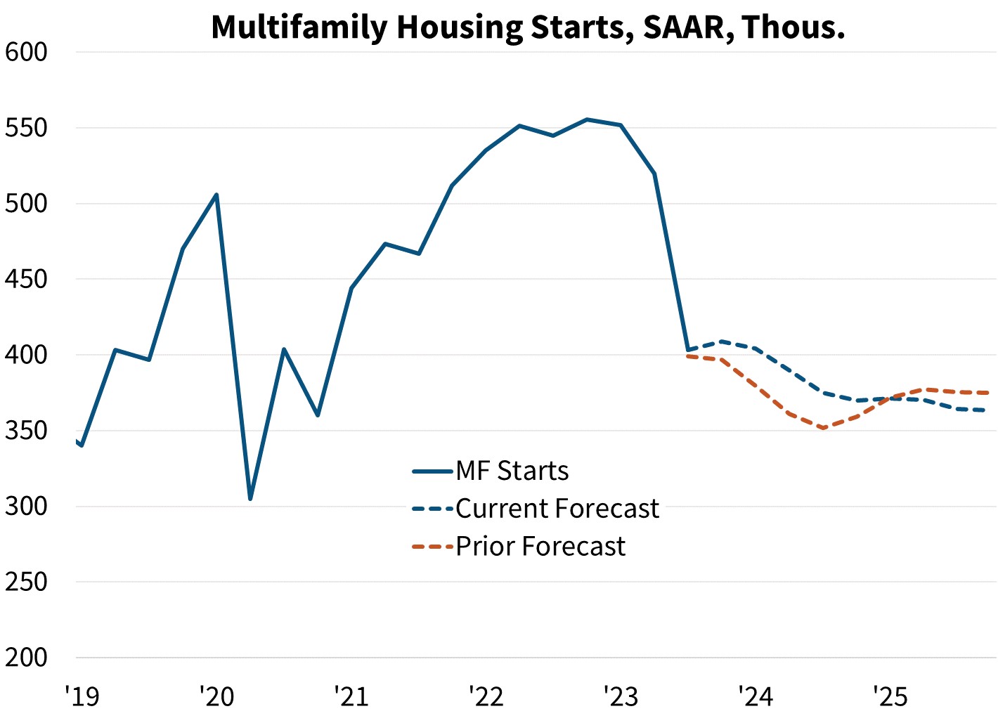 Multifamily housing starts rose to a SAAR of 417,000, while permits fell to a SAAR of 490,000. We have slightly upgraded our near-term forecast based on this incoming data. Soft rent growth coupled with increasing supply deliveries is keeping our forecast for multifamily starts muted, but due to the revision to our interest rate and macroeconomic outlook, multifamily starts were also revised upward. However, we still project a decline of 18.3 percent in 2024 from 2023.