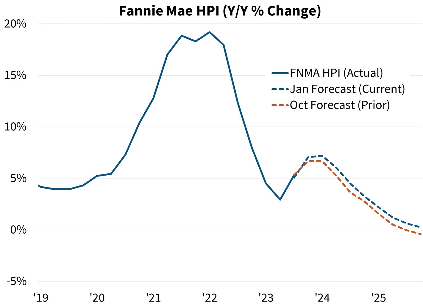 As measured by the Fannie Mae Home Price Index, home prices ended 2023 up 7.1 percent on a Q4/Q4 basis, a strong pace of growth, especially given the surge in mortgage rates over the year and worsening affordability conditions. While moderating mortgage rates going forward will help support home prices, affordability is still going to remain historically challenging. Combined with a cooling labor market, we see the ability of homebuyers to keep pushing prices upward as more limited. The aforementioned unfreezing of the existing home sales market, combined with increasing supply of new homes coming online, should help loosen the market somewhat. We believe slowing or even declining multifamily rents in much of the country will also make the rent vs. buy calculus shift comparatively more favorable to renting multifamily units, reducing upward pressure on single-family home prices.