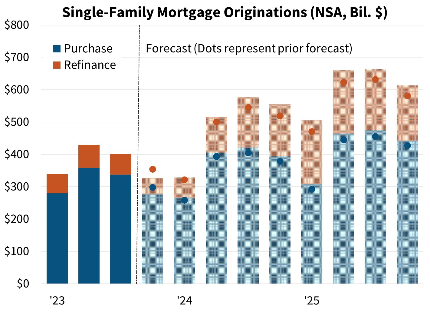 With an expectation of rising home sales, moderating mortgage rates, a downward drift in the cash share of home sales, and continued positive home price growth, we forecast single-family mortgage origination dollar volume to grow significantly in 2024, albeit from a depressed starting level. We expect 2024 single-family purchase origination volumes will be $1.5 trillion, a 19 percent increase from $1.3 trillion in 2023.