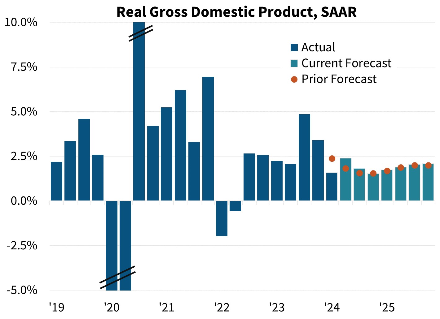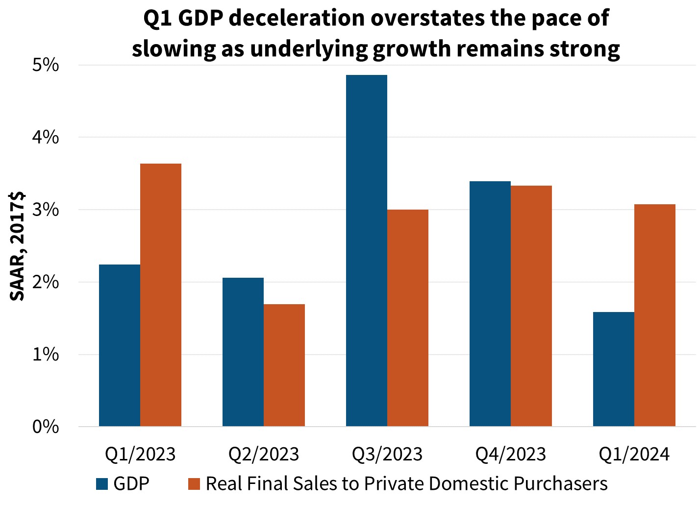 First quarter 2024 GDP increased at a 1.6 percent annualized rate, below both consensus and our expectations. However, the headline miss was due almost entirely to the volatile net exports and business inventory investment categories; real consumption growth and private fixed investment were in line with our forecast. Real final sales to private domestic purchasers, the sum of personal consumption and gross private fixed investment, increased at a solid 3.1 percent annualized rate, nearly identical to each of the prior two quarters. While we see the underlying growth trend modestly decelerating, the weak Q1 topline figure likely overstates the pace of deceleration, and we expect a solid snap back in Q2, which we have upwardly revised in our outlook. However, on net, this quarterly change has no material impact on our full-year 2024 total growth forecast.