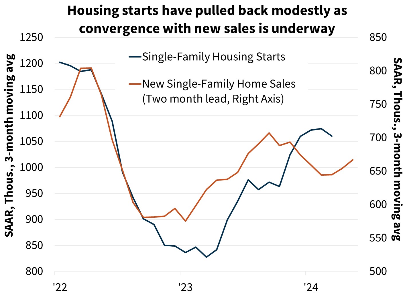 New home construction and sales look to be converging as expected. We had previously noted that the pace of starts has been elevated relative to the new home sales pace in recent months. Single-family starts fell in March by 8.7 percent, followed by a 0.4 percent decline in April, while new sales rose 8.8 percent in March. We expect this convergence to continue in the near term via a combination of homebuilders offering incentives to move existing inventories and a modest slowing in the pace of starts. While existing home sales listings are loosening somewhat, the housing market remains tight in most metros. As such, we continue to expect a solid pace of new home construction over the next two years as buyers look to new homes due to the limited existing home supply.