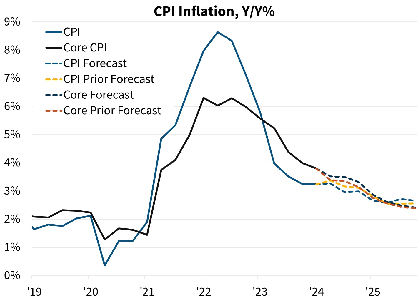 Q1 2024 GDP grew at an annualized 1.6 percent, well below the consensus and our estimate of 2.4 percent, with the difference driven mostly by net exports and the change in business inventories. Due to stronger “core” GDP we anticipate a rebound and, therefore, have revised upward our Q2 and Q3 forecasts, but our forecast for total yearly growth in both 2024 and 2025 is unchanged at 1.8 percent Q4/Q4 and 1.9 percent Q4/Q4, respectively.