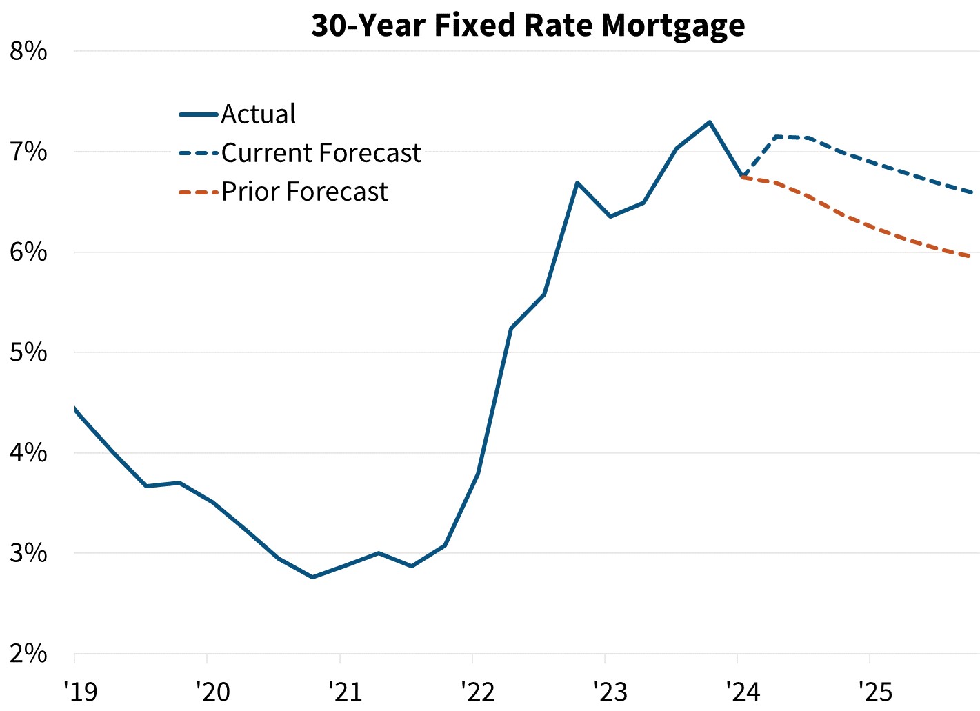 We revised our mortgage rate forecast upward month over month. We now forecast the 30-year fixed mortgage rate to average 7.0 percent in 2024 and 6.7 percent in 2025. However, interest rates remain volatile, particularly given changes in Fed policy expectations, which adds risk to our outlook. Following the completion of our start-of-the-month interest rate forecast, long-run rates have pulled back around 20 basis points, leading to some downside risk to our current baseline mortgage rate forecast.