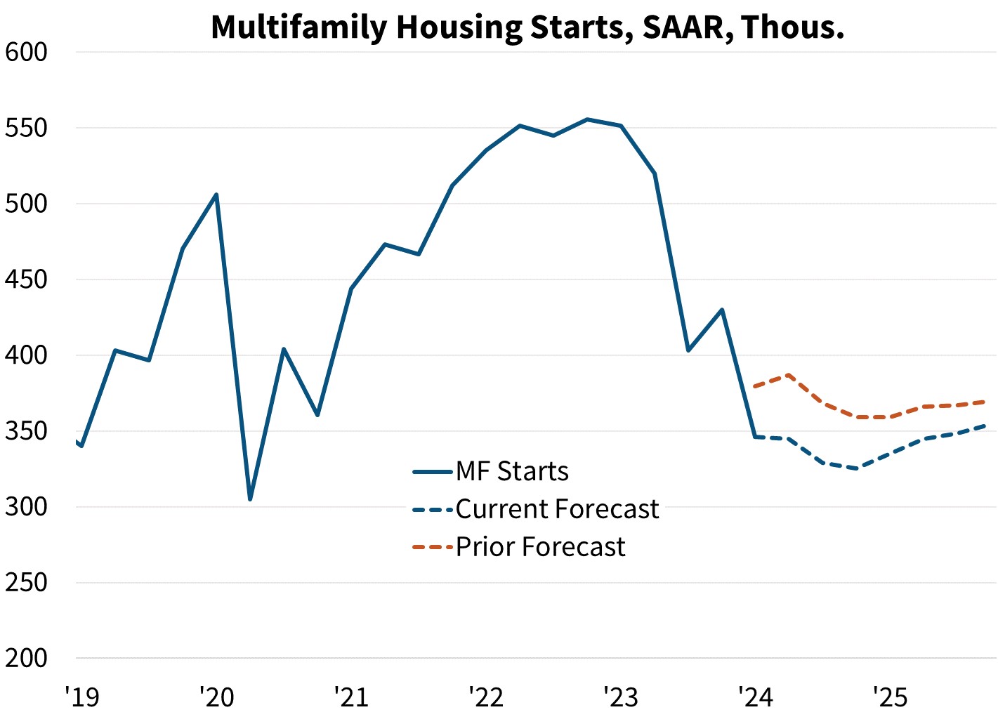 We have downgraded our forecast through the forecast horizon, as we believe multifamily starts remain likely to decline due to muted national rent growth, the large number of multifamily units near completion, and a higher interest rate outlook.