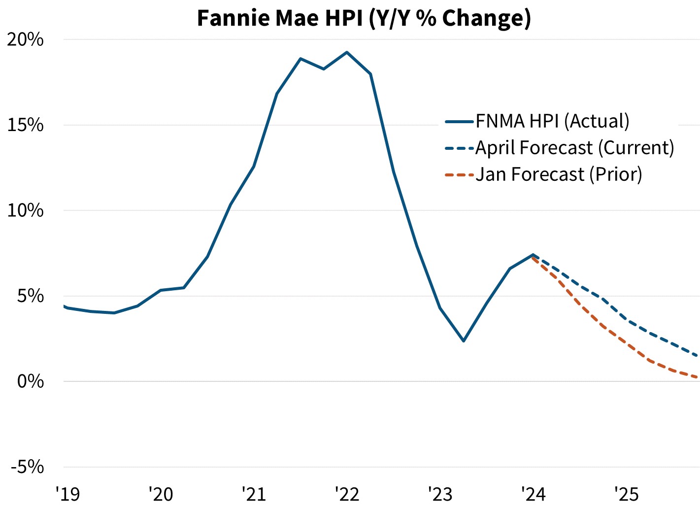 Home prices grew 6.6 percent Q4/Q4 in 2023, according to the most recently published non-seasonally adjusted Fannie Mae Home Price Index (HPI) and are forecast to rise 4.8 percent in 2024 and 1.5 percent in 2025 on a Q4/Q4 basis. Our next home price update will be in July.