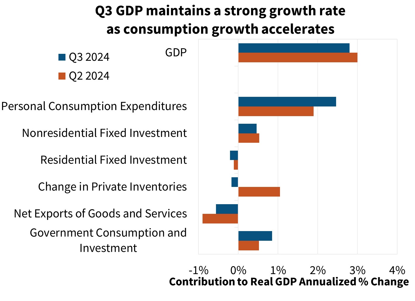 Third-quarter GDP grew at a 2.8 percent annualized rate, broadly in line with our expectations. Consumption growth was particularly robust, accelerating from a 2.8 percent annualized growth rate in the second quarter to 3.7 percent in the third quarter. This somewhat stronger-than-expected consumption in Q3 has pushed up our forecast for consumer spending over the next couple of quarters. Over the longer term, though, our view that consumption growth will decelerate to a pace consistent with our long-run estimates of sustainable income and population growth is unchanged. Notably, real disposable personal income grew at a much slower 1.6 percent annualized rate in Q3. We forecast GDP growth to decelerate from an estimated 2.4 percent in 2024 to 2.1 percent in 2025 and 2.2 percent in 2026, in part due to an expectation of moderating consumer spending.
