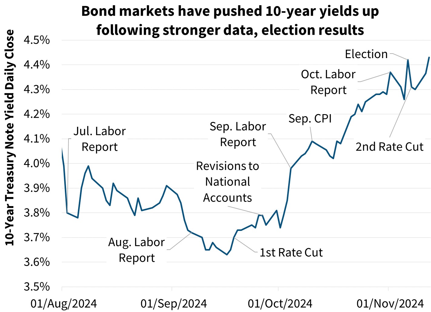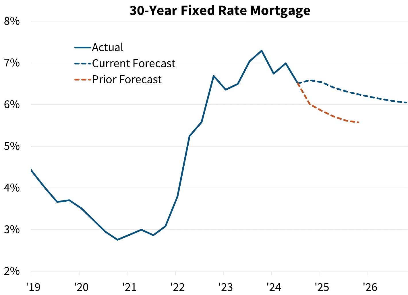 Our mortgage rate outlook has been revised upward significantly this month, consistent with recent movement in long-duration bonds. As we stated in our October commentary, we attribute some of the movement in the 10-year Treasury — from a recent low near 3.6 percent in the middle of September to about 4.4 percent as of this writing — to incoming strong consumer spending and hotter inflation data that signal the economy remains on strong footing, as well as a related expectation of less monetary policy easing over the next several quarters. More recently, we believe some of the upward movement may also be due to market expectations of more expansive fiscal policy following the results of the 2024 election, as well as general heightened policy uncertainty.