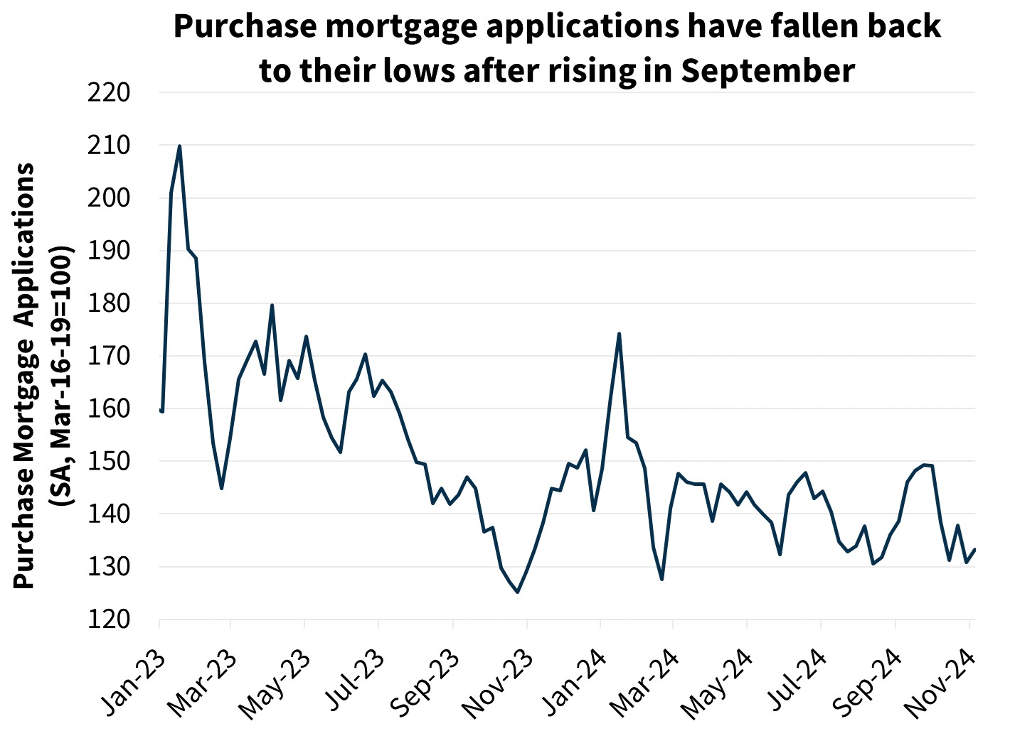 Existing home sales fell in September by 1.0 percent to an annualized pace of 3.84 million, a new cycle low. Based on the 7.4 percent rise in pending sales in September, which lead closings on average by 30-45 days, and purchase mortgage application data, we expect a bump in sales in October. However, with the more recent rise in mortgage rates over the past two months (the 30-year fixed rate mortgage is now at 6.78 percent for the week ending November 14, according to Freddie Mac), any near-term resurgence in home sales looks unlikely. Mortgage applications over the last month have fallen back to their recent lows, pointing to lower home sales to close out the year.