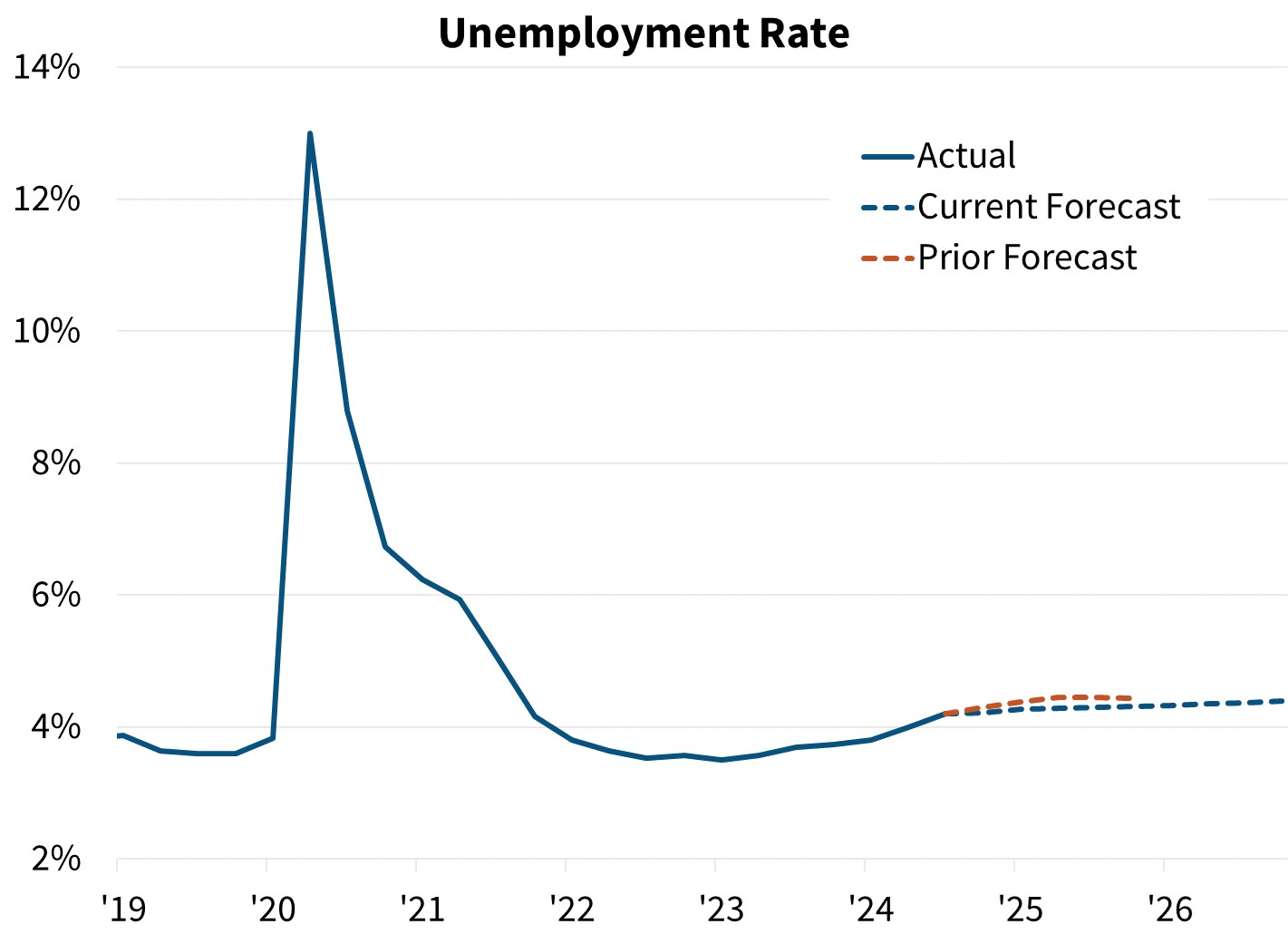 With recent data, including third quarter real gross domestic product (GDP) being largely in line with our prior outlook, we have only minimally changed our growth forecast. We now project 2024 and 2025 GDP growth on a Q4/Q4 basis will be 2.4 percent and 2.1 percent, respectively, up one-tenth each. For our inaugural 2026 outlook, we forecast 2026 GDP growth will be 2.2 percent.