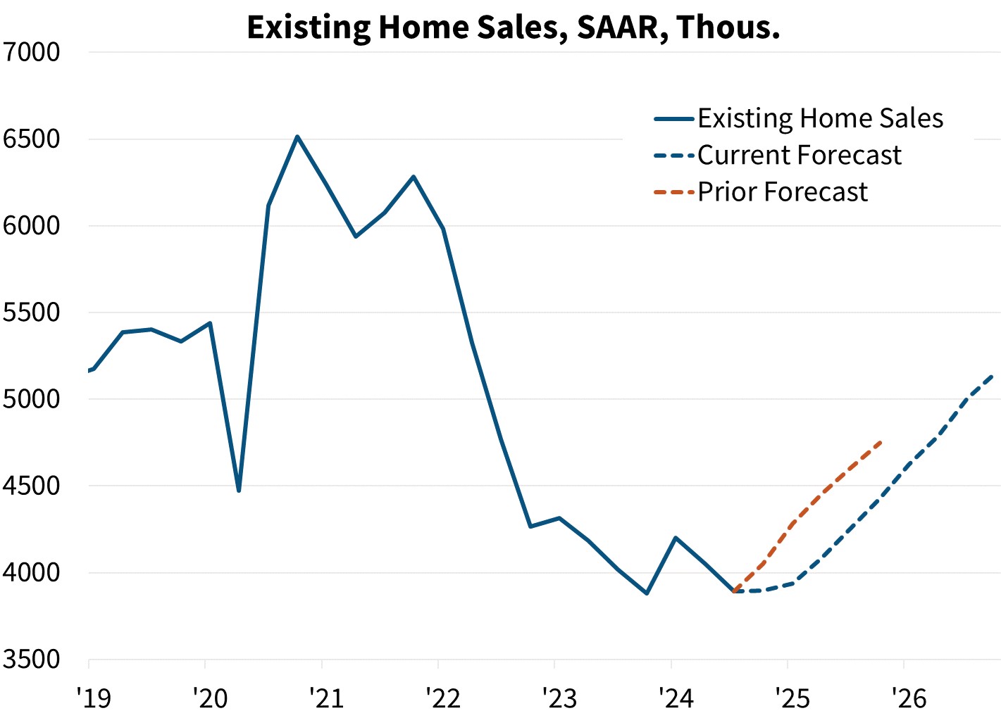 A combination of weak purchase activity in recent months and our upwardly revised outlook on mortgage rates led to a downward revision to our existing home sales outlook for the remainder of 2024 and into 2025. We now expect existing home sales will be 4.01 million in 2024 (4.06 million previously), which would represent a nearly 30-year low, and 4.18 million in 2025 (4.52 million previously). For our inaugural 2026 forecast, we project some recovery, with existing home sales rising to 4.89 million — reflecting waning lock-in effects, modest affordability improvements as house price growth decelerates, and growing pent-up demand to move.