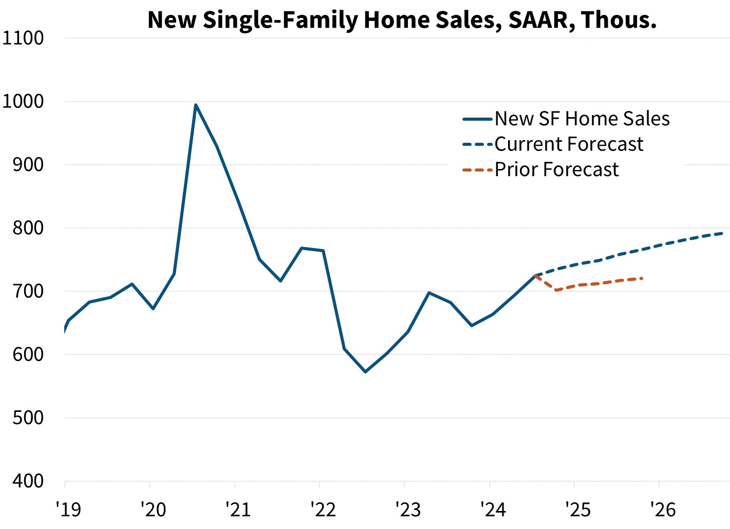 New single-family home sales rose 4.1 percent in September to a SAAR of 738,000. We have upwardly revised our new home sales outlook due to stronger incoming data and a decline in the expected flow of existing homes being listed for sale, helping to support new home sales and leading to a gradual increase over the forecast horizon.