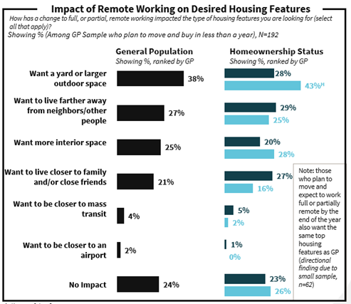 These potential near-term buyers were also asked if remote working had any impact on their desired home features. Unsurprisingly, given the changing work paradigm, as well as behavioral shifts likely stemming from the pandemic, 38% of all respondents said they wanted more outdoor/yard space, while 27% said they wanted to live farther away from neighbors. Renters, in particular, wanted more outdoor space, while current homeowners said living closer to family and friends was a priority.