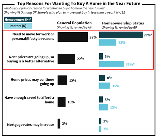 We also asked a smaller segment of the population – consumers who plan to move and buy a home in the next year – why they were moving. A majority of current homeowners said they planned to move due to work or personal/lifestyle reasons, whereas the top reason cited by renters was rising rent prices, as noted above.