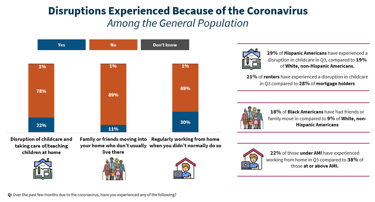 In addition to financial outcomes, the pandemic has had a significant effect on the day-to-day experiences of households: Nearly one in five survey respondents have experienced disruption of childcare, one in ten have had family and or friends move in, and one in three are regularly working from home when they normally did not do so. A smaller percentage of those at lower incomes are reporting regularly working at home when they normally did not do so – 22% of those earning less than the area median income (AMI) have experienced working from home in Q3 compared to 38% of those at or above AMI.