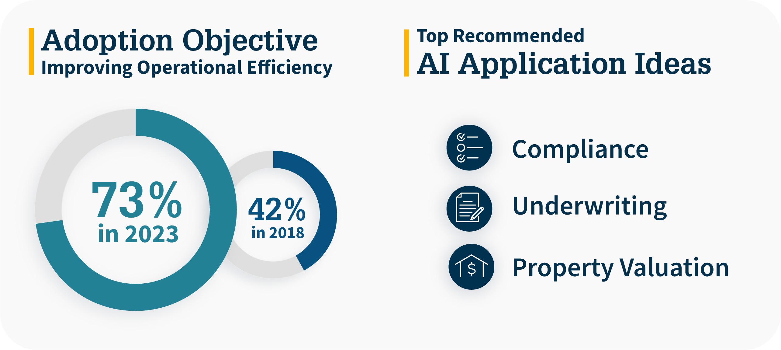 - This year, lenders overwhelmingly cited improving operational efficiency as the primary motivation behind adopting AI/ML (73% in 2023 vs. 42% in 2018). The use case of enhancing the consumer/borrower experience faded significantly as a top reason (7% in 2023 vs. 41% in 2018).