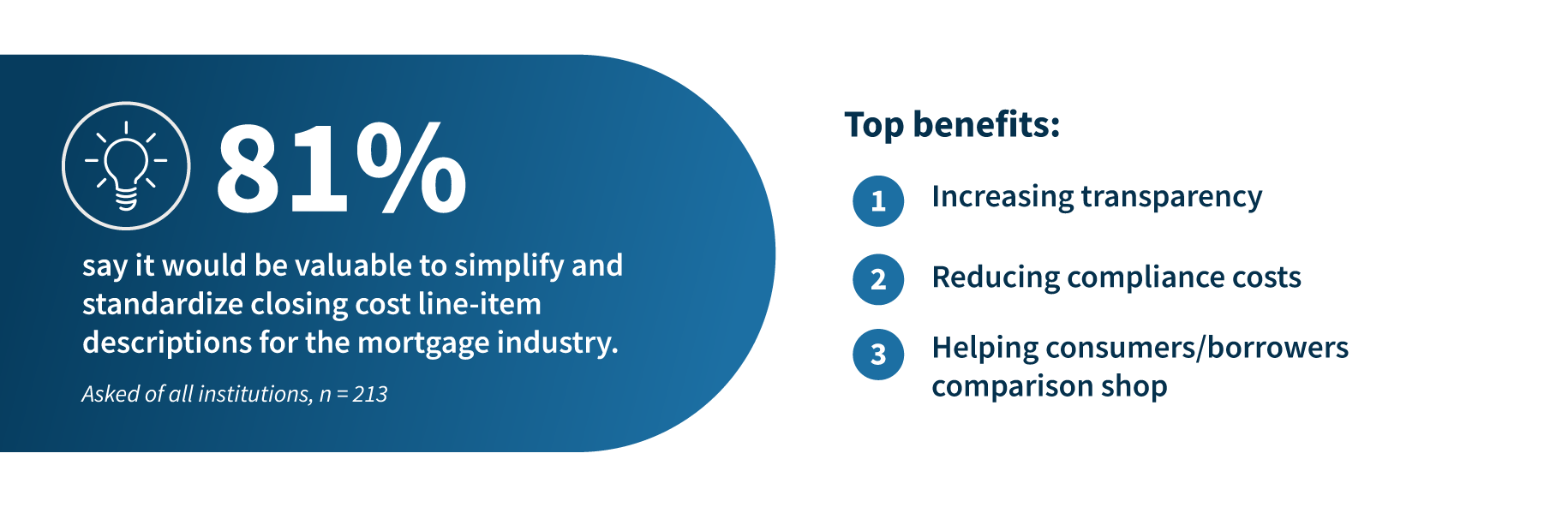 - The majority of lenders (81%) agreed that simplifying and standardizing closing cost line-item descriptions would be valuable for the mortgage industry. Respondents indicated that increasing transparency, particularly for borrowers, would be the most important benefit of such an effort, followed by decreasing compliance costs, and helping consumers comparison-shop.