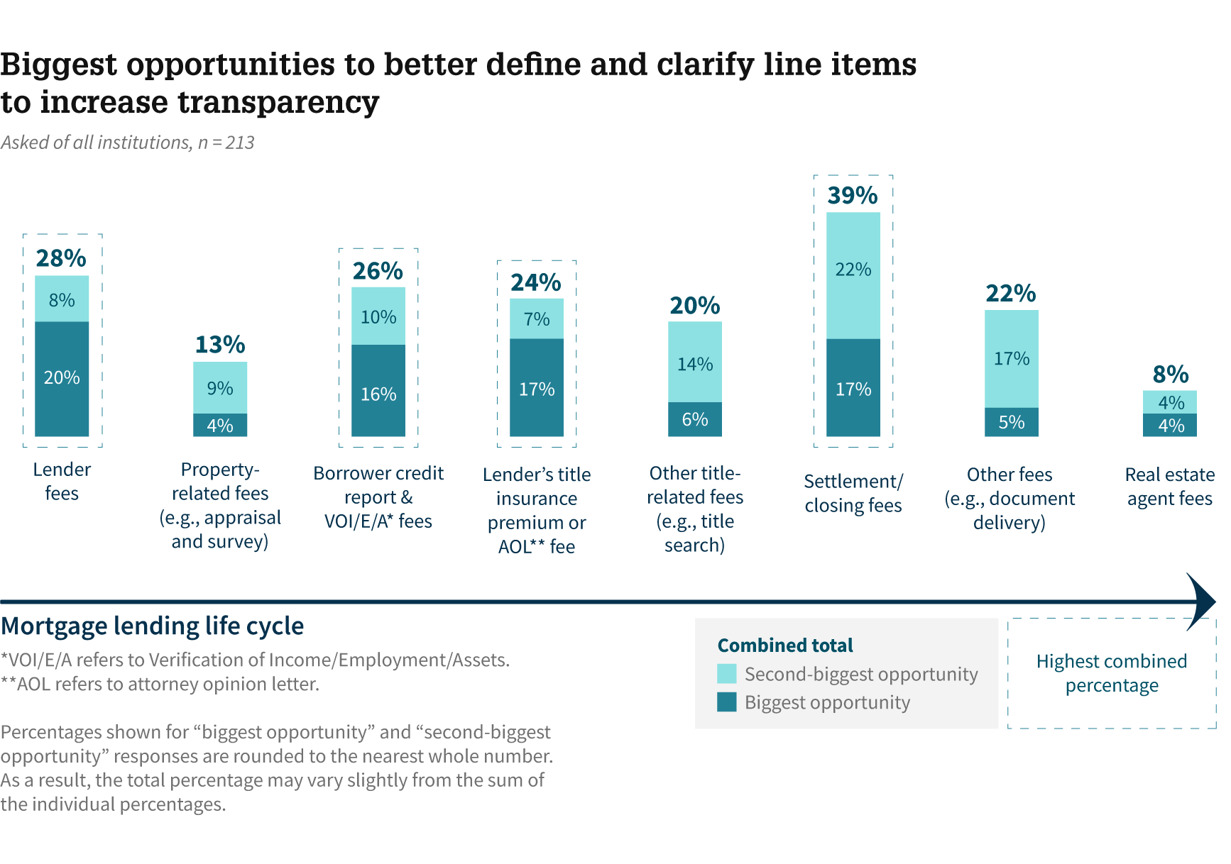 - To help improve transparency for borrowers, several closing cost types were highlighted by lenders as being especially likely to benefit from further clarity, including lender fees, settlement/closing fees, lender's title insurance premium or attorney opinion letter (AOL) fees, and borrower credit report and verification of income/employment/assets (VOI/E/A) fees.4