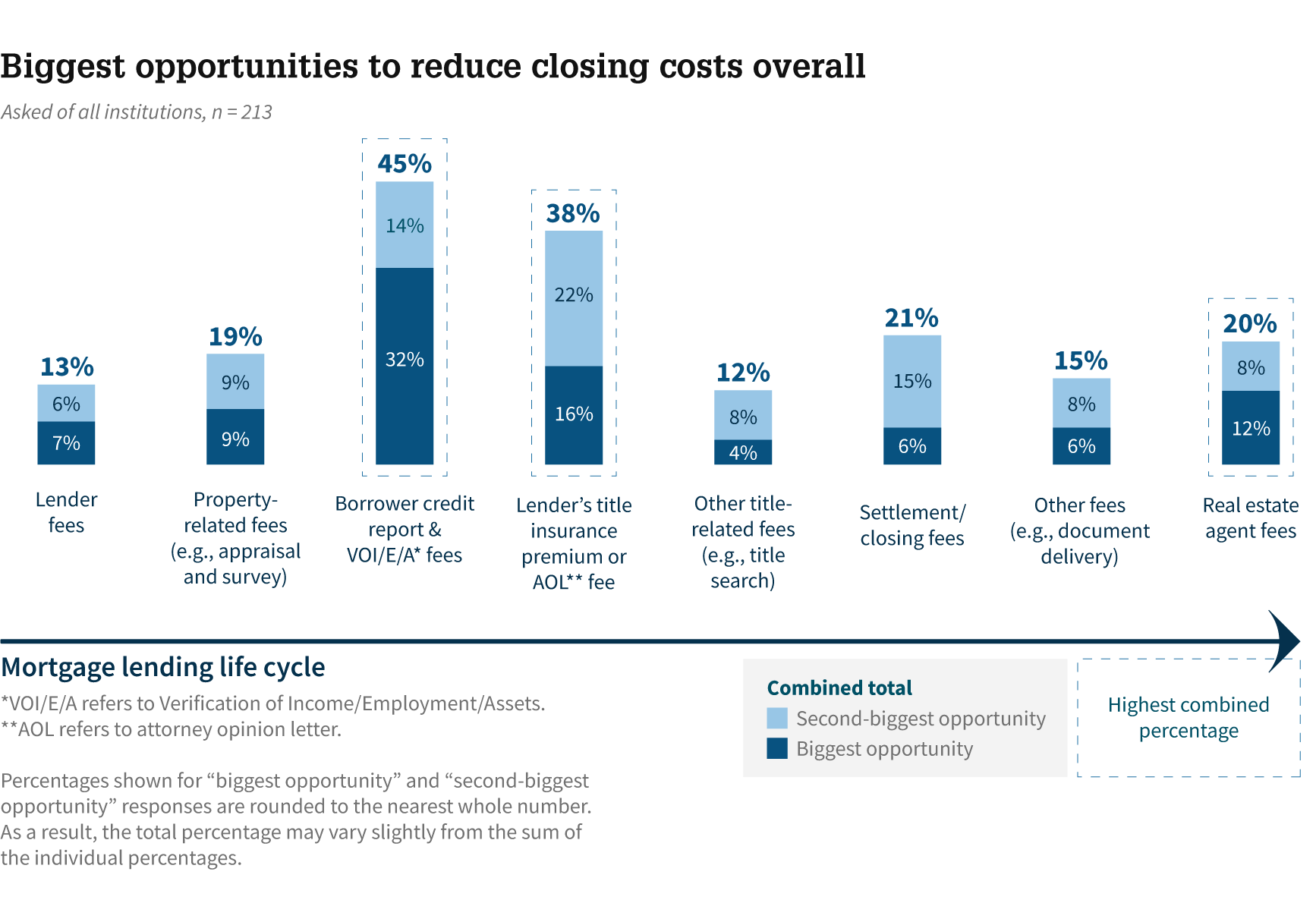 - We asked lenders to identify the areas where they believe closing costs can be reduced, and the most common responses were borrower credit report and VOI/E/A fees5, lender's title insurance premium or AOL fees, and real estate agent commissions, in that order.